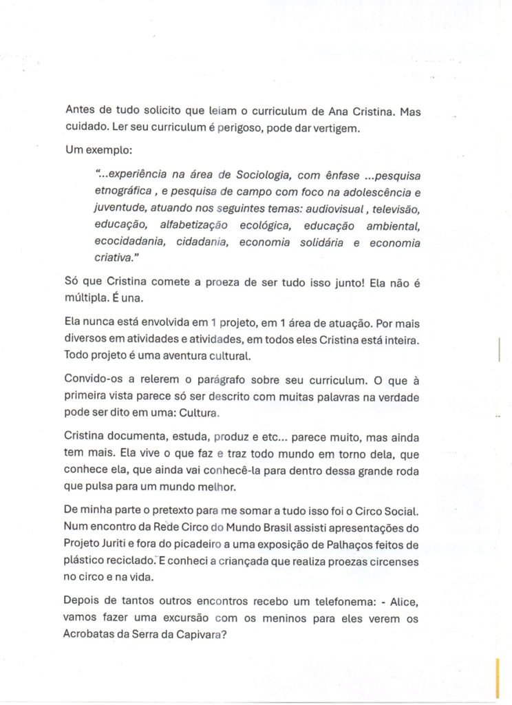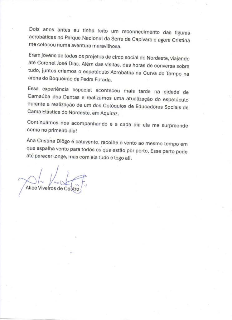 Alice Viveiros faz parte da história do circo social brasileiro, com sua presença/referência para diversos encontros promovidos pela RCMBR e de suas entidades parceiras e com a socialização dos seus conteúdos sobre circo, com destaque para o Livro o Elogio a Bobagem que generosamente dou exemplares para todos os circos sociais brasileiros.