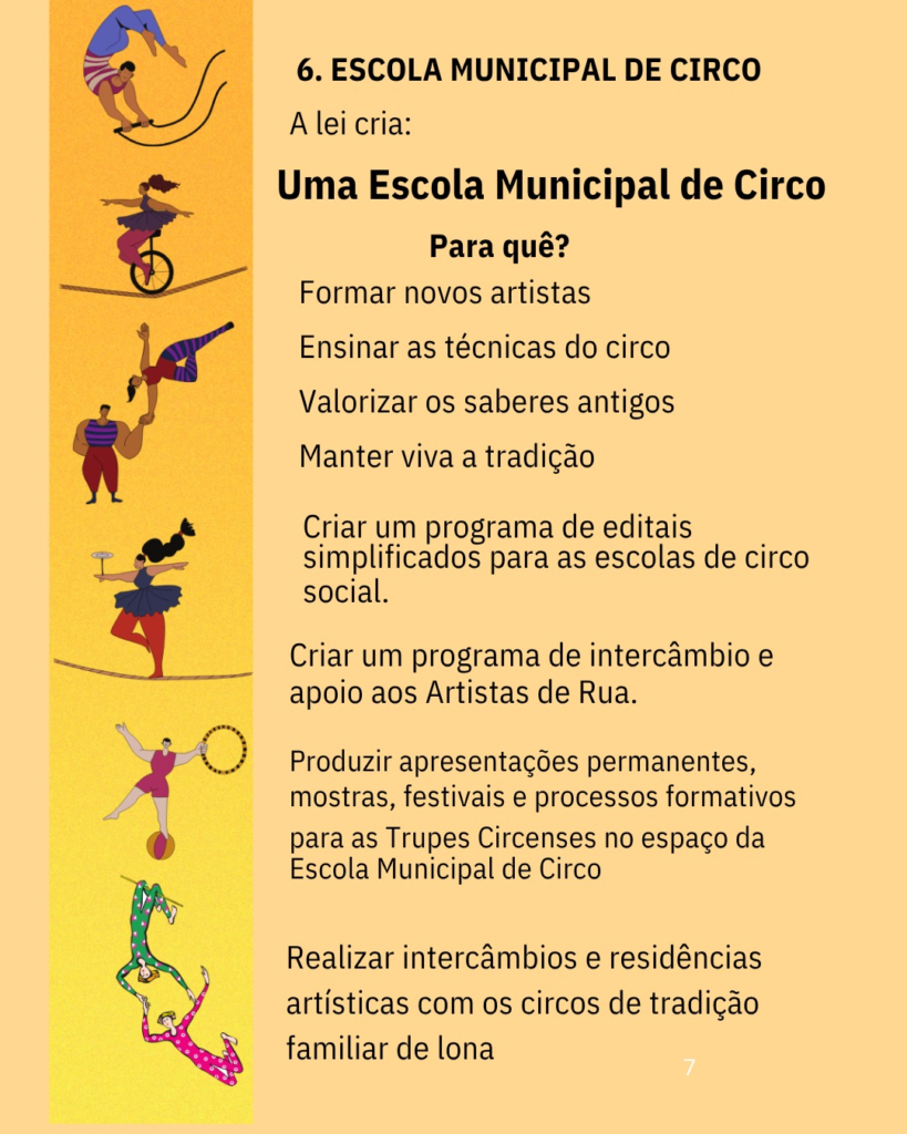 A cartilha também detalha propostas estruturantes, como a criação da Escola Municipal de Circo, a abertura de editais simplificados para escolas de circo social, programas de intercâmbio, apoio aos artistas de rua e residências artísticas com circos de tradição familiar.