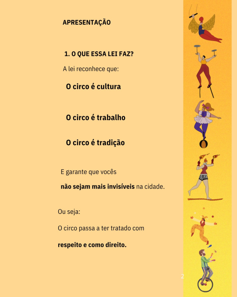 Ao longo de suas páginas, a publicação explica os pontos centrais da futura lei municipal, mostrando de forma objetiva o que poderá mudar na vida dos circenses em Juazeiro do Norte.