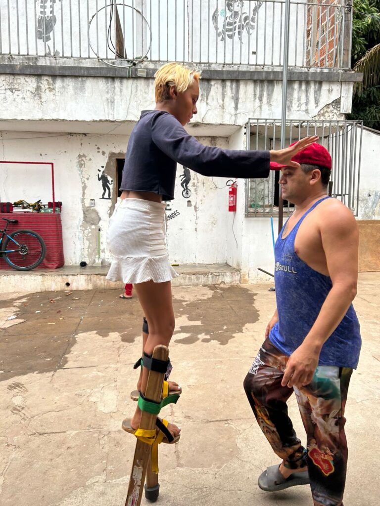 A prática da perna-de-pau foi o eixo da oficina de equilibrismo, convidando crianças e jovens a experimentarem a sensação de crescer e ocupar outras alturas.